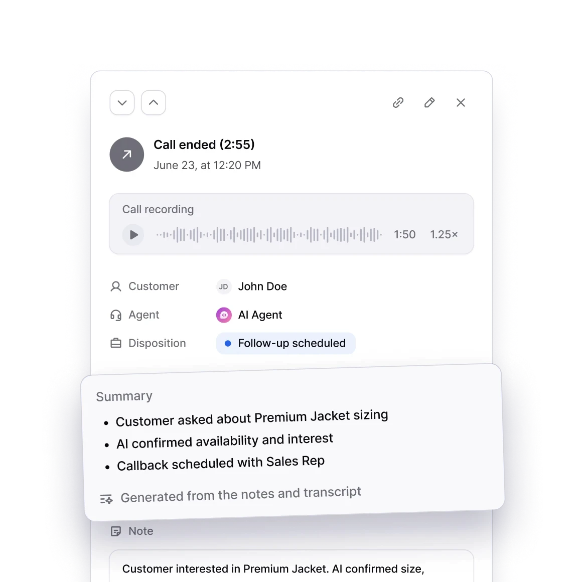You get recordings, transcripts and AI call summaries that highlights for every call, making it easy to coach and iterate on the scripts and knowledge required to provide exceptional experience.