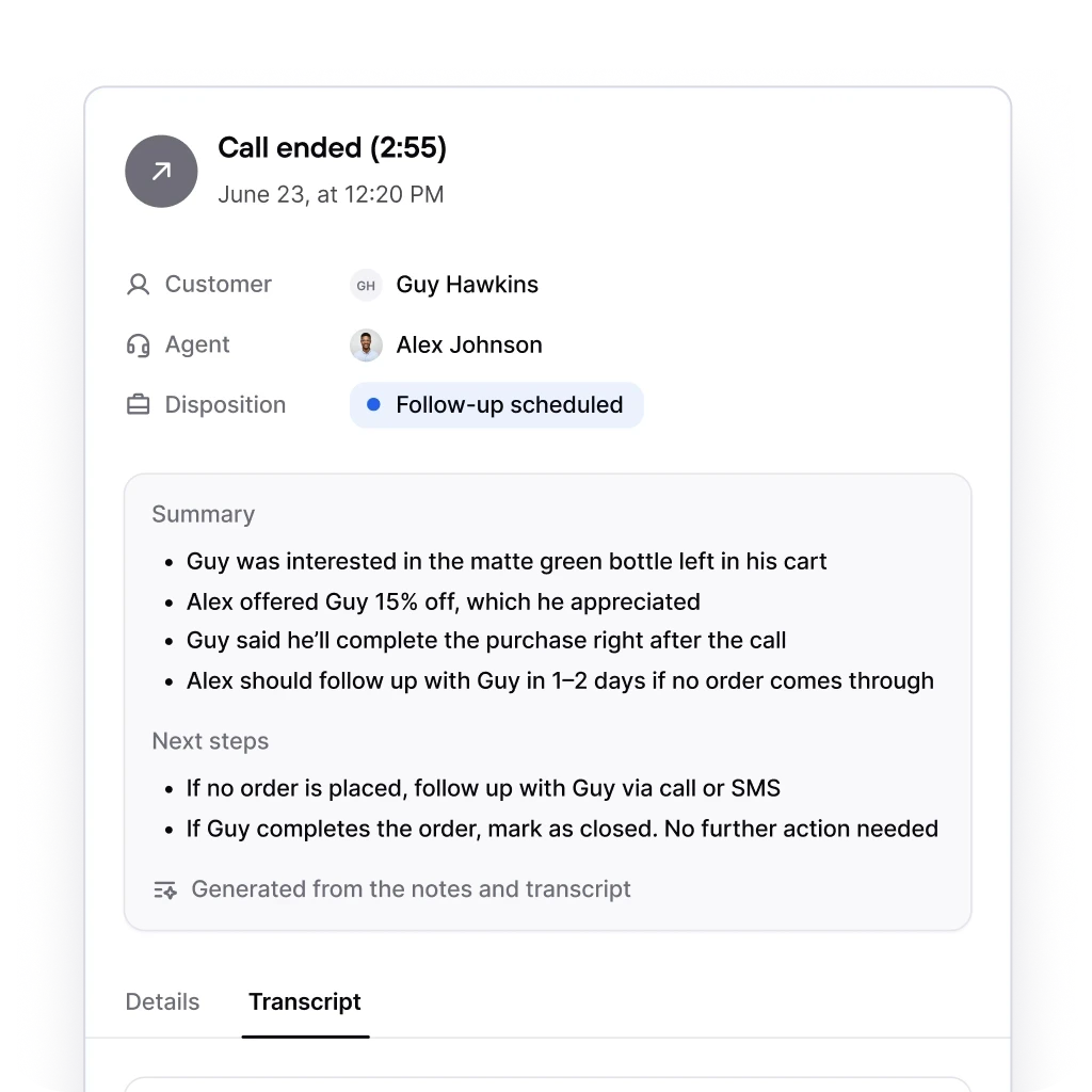 AI transcripts – Every call is recorded and transcribed automatically, so nothing gets lost and reviews are instant.