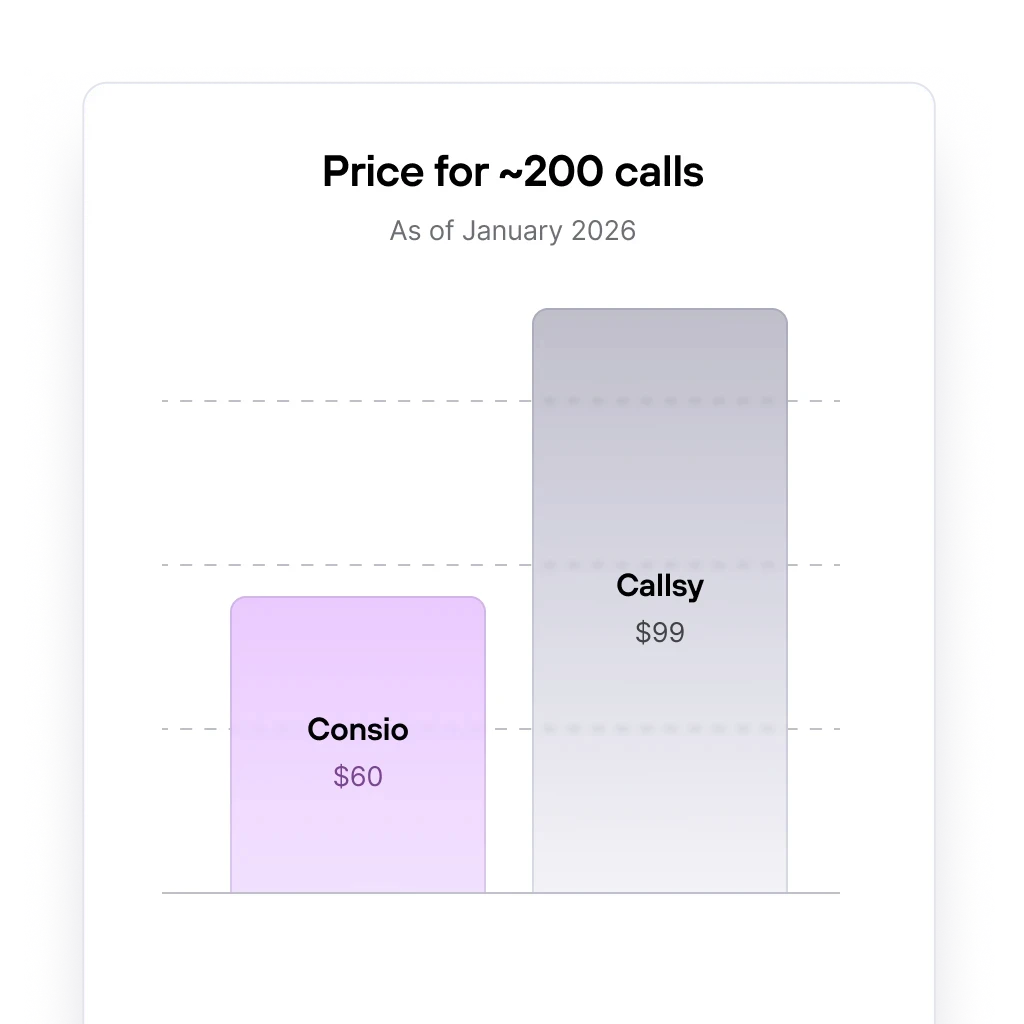 More call capacity – Consio’s $60 plan includes 400 minutes (≈200 calls), giving you more volume for less than Callsy’s $99 / 200 calls.