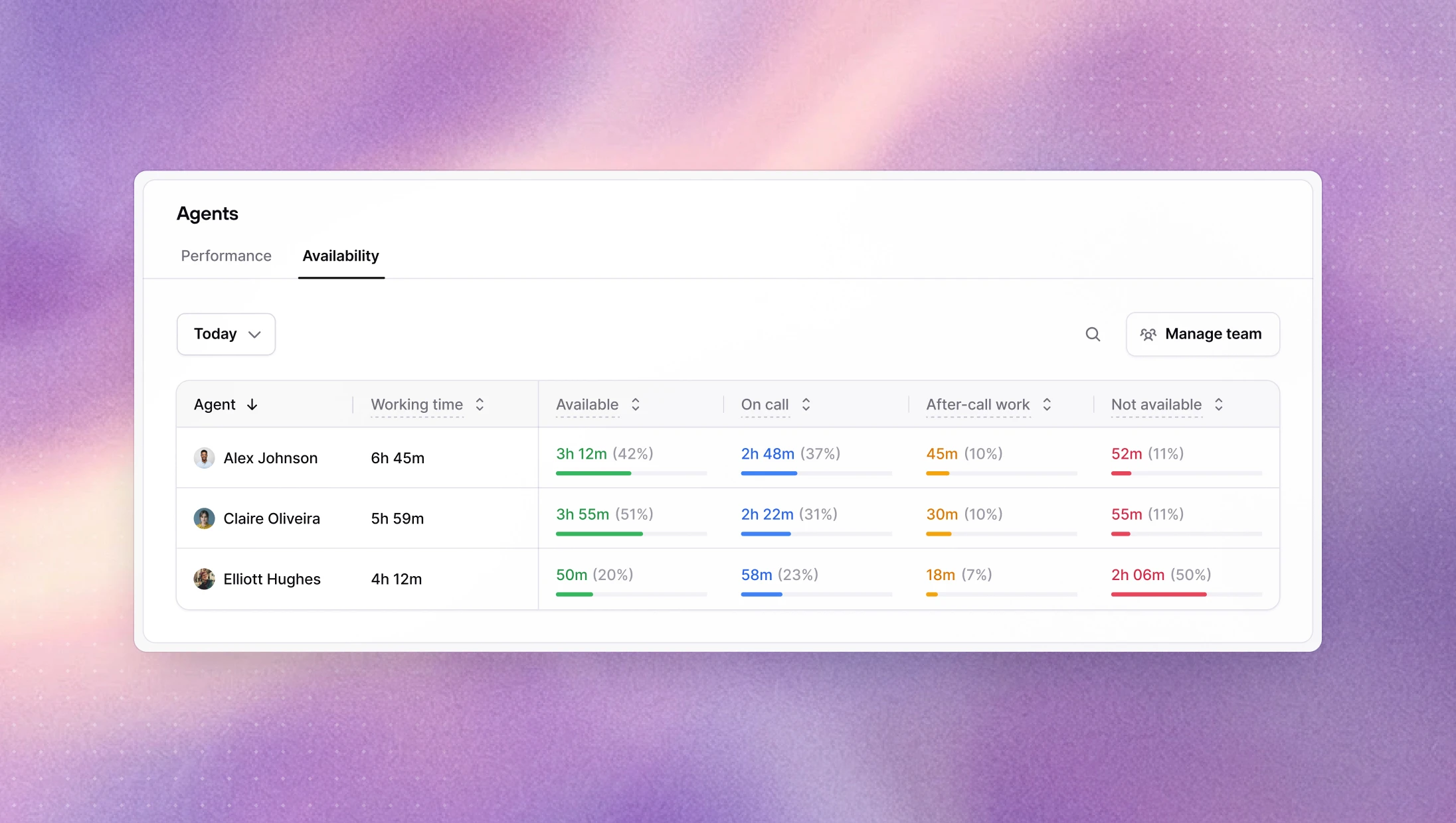 A new Availability tab on the Agents page shows how much time each agent spent in each availability status over a selected period. Managers can now identify agents who are frequently unavailable during business hours without having to dig through individual call logs.